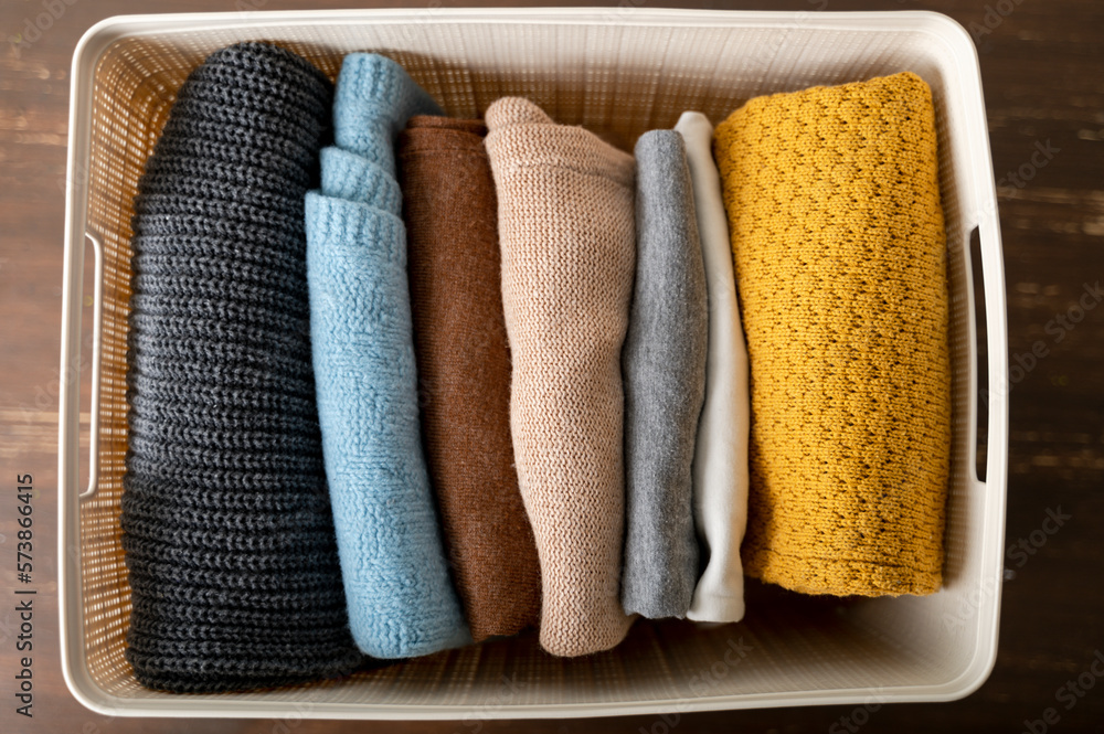 Plastic Box with used clothing to donate on wooden table. Reuse. Top view
