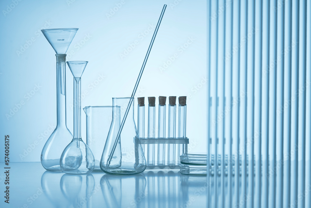 Glass test tubes, various dishes of a chemical laboratory on a light background.