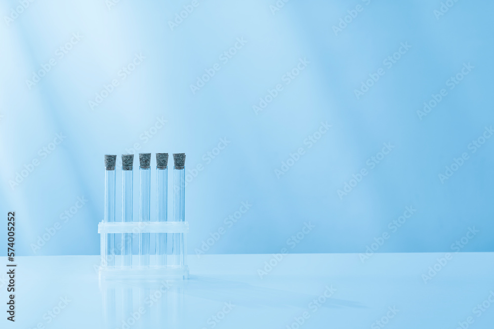 Glass test tubes, dishes of a chemical laboratory on a light background.