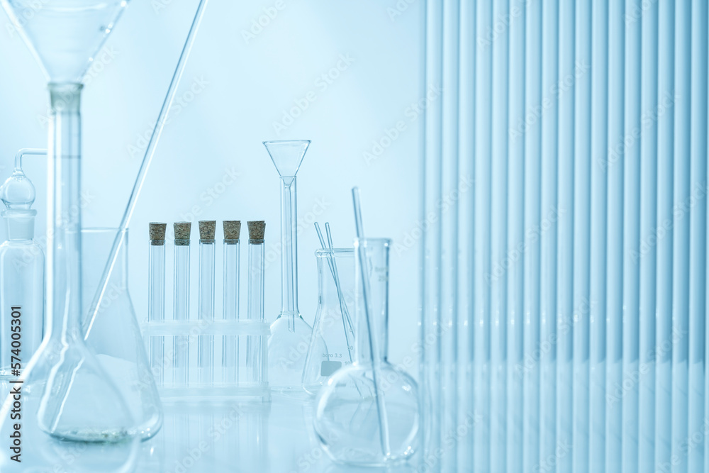Glass test tubes, various dishes of a chemical laboratory on a light background.