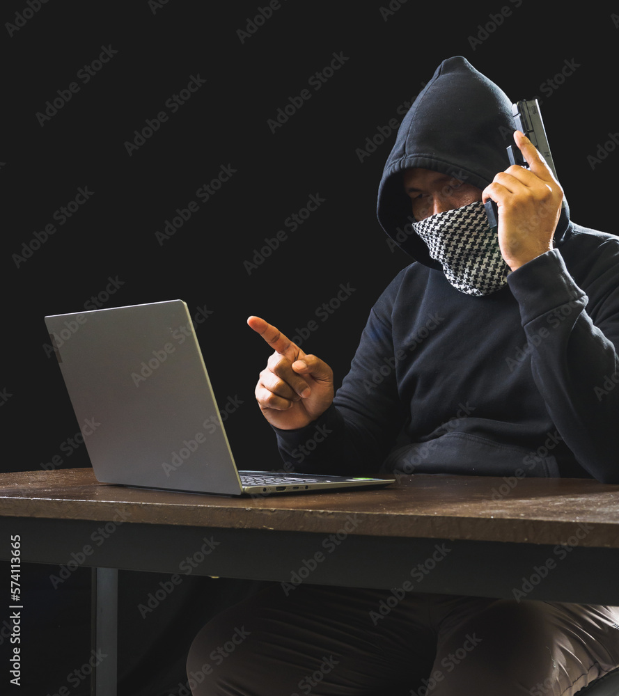 Hacker spy man one person in black hoodie sitting on a table looking computer laptop used login password attack security to circulate data digital in internet network system, night dark background.