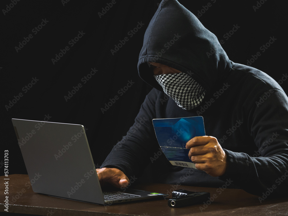 Hacker spy man one person in black hoodie sitting on a table looking computer laptop used login password attack security to circulate data digital in internet network system, night dark background.