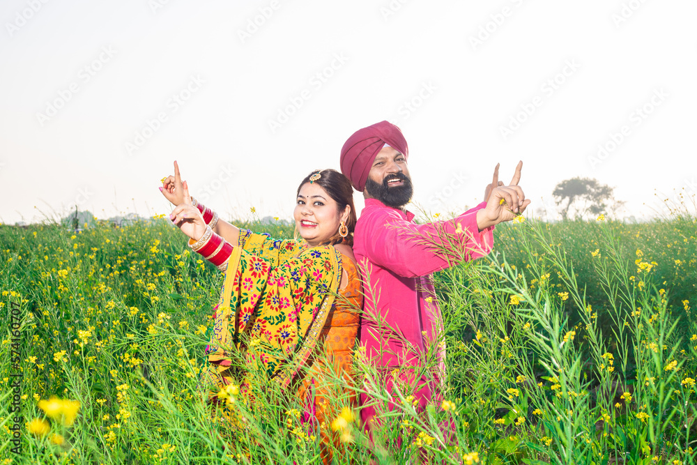 Happy indian sikh couple enjoy punjabi bhangra dance in agriculture field celebrating Baisakhi or lohri festival together, Culture of india. people of punjab.
