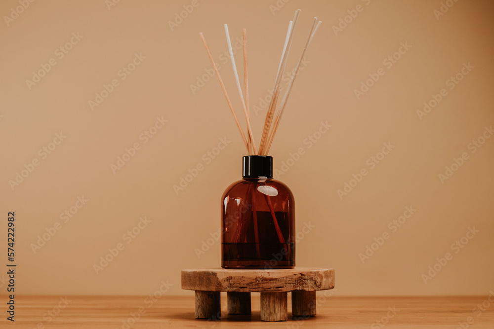 Essential oil diffuser with sticks standing on wooden platform. Beige background. Copy space. Template