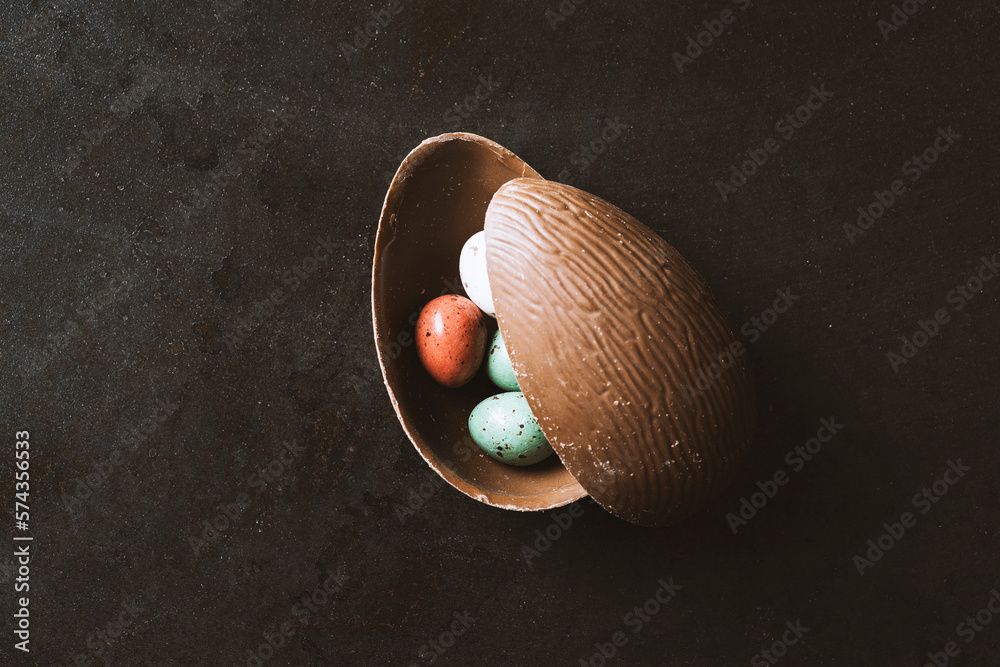 Cracked easter chocolate egg full with small chocolate eggs on black background