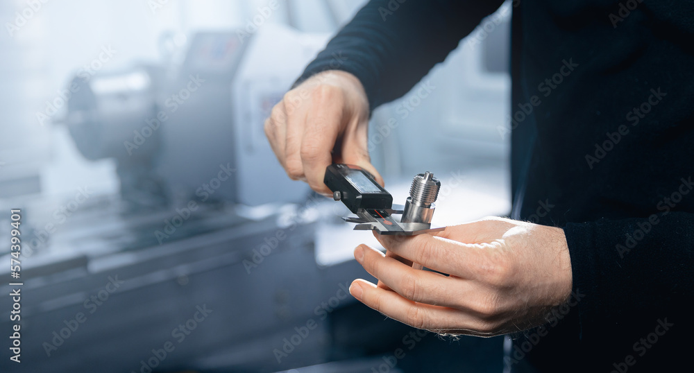 Man engineer takes dimensions from a part after Working CNC turning cutting metal. Concept Industry machine