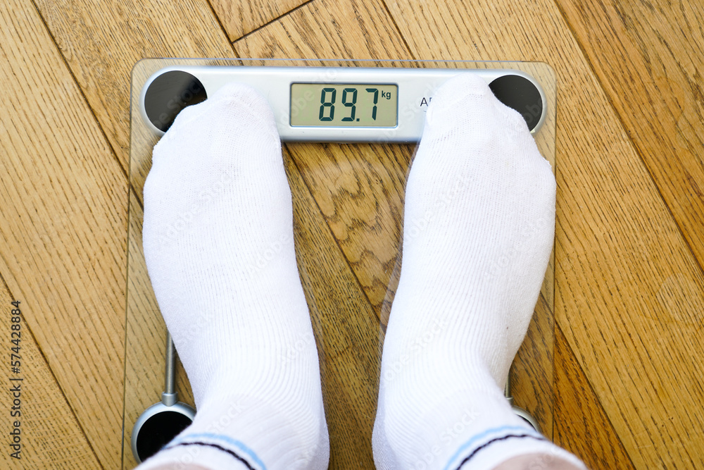 A man in white socks stands on a transparent electronic floor scale, the weight reading is 89 kg