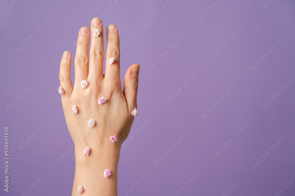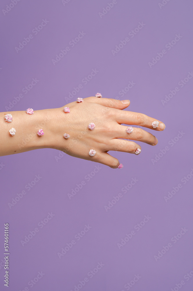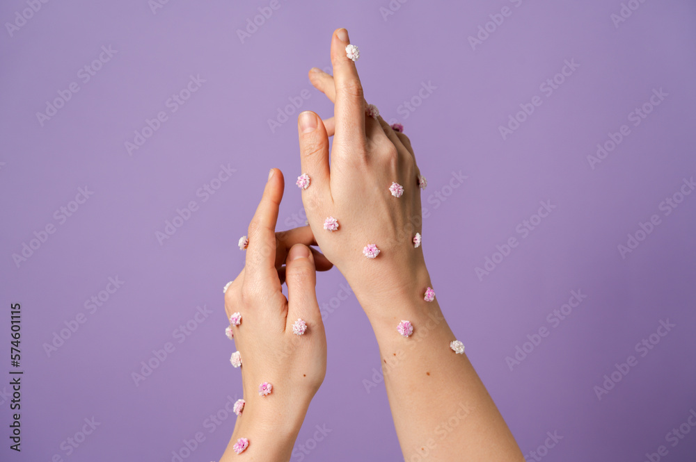 Two hands covered by small flowers holding each other on purple. Care, support concept