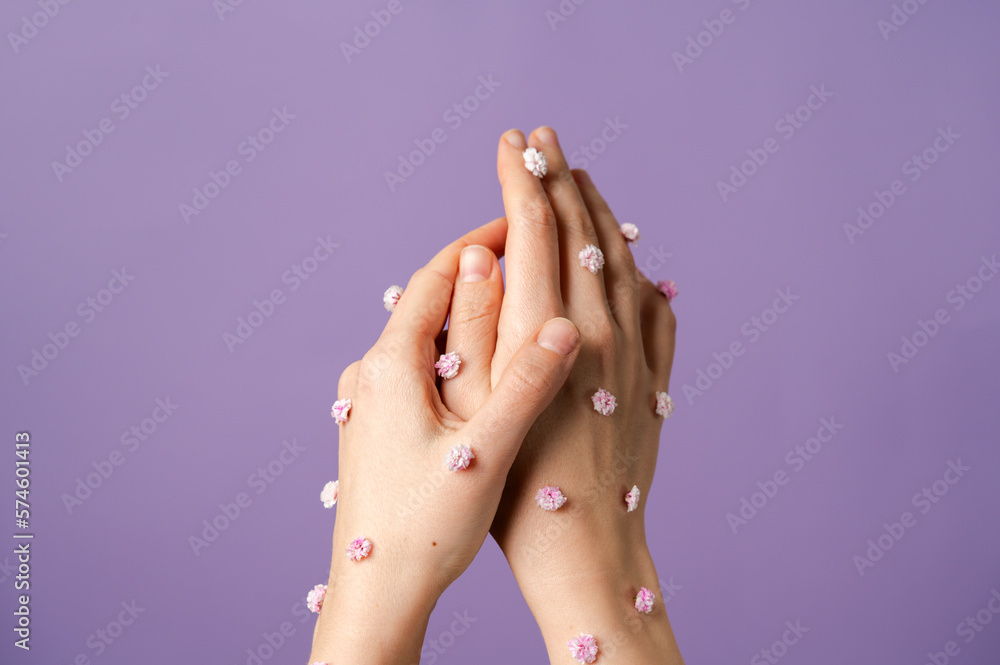 Two hands covered by small flowers holding each other on purple. Care, support concept