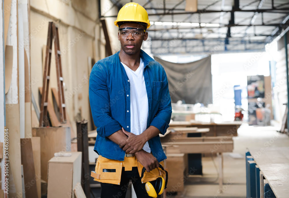 Male carpenter standing in carpentry workshop. A multiracial repairman at work in wood furniture building factory. Portrait of joiner man with protective gear worker standing in woodwork manufacturing