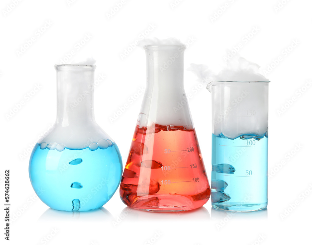 Laboratory glassware with colorful liquids and steam isolated on white. Chemical reaction