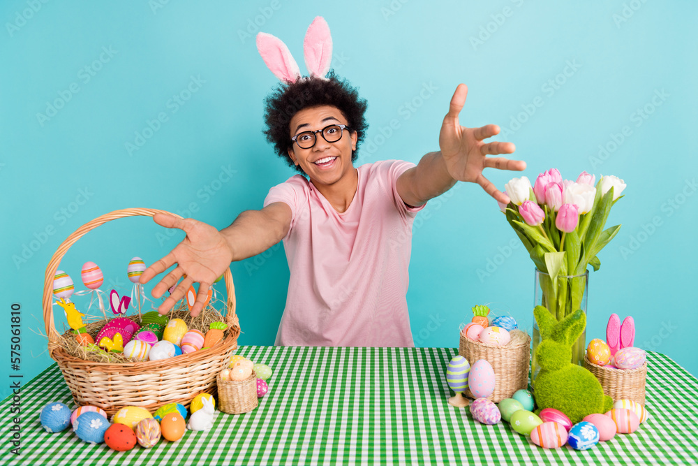 Photo of young guy spring feast easter holiday embrace you bunny headband fresh tulips colored eggs bucket isolated on aquamarine color background