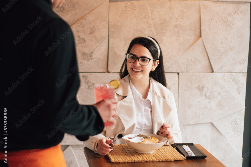 A Latina white woman is receiving her order at a restaurant. A smiling Latin woman is receiving a refreshing drink in a fancy restaurant.