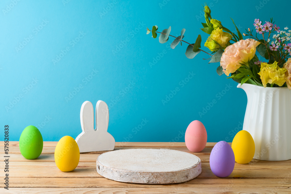 Easter holiday concept with wooden log, easter eggs and flowers on wooden table over blue background. Spring mock up for design and product display