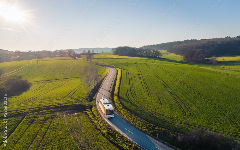 high angle view of bus driving on the winding road through the fields in the countryside under the blue sky