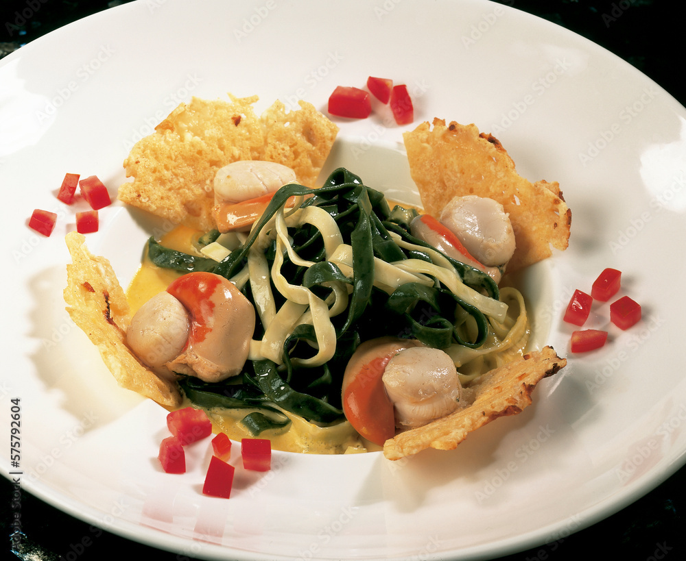 Italian food, pasta with olive oil and shellfish -sea food and tomato decoration on the plate. May 2018