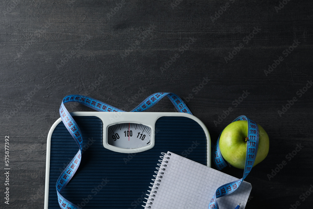 Diet and weight loss, healthy lifestyle, composition with measuring tape, space for text