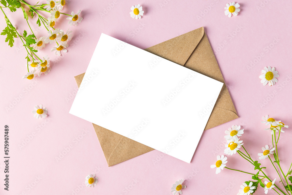 Blank greeting card in frame made of white chamomile flowers on pink background. Wedding invitation. Mock up