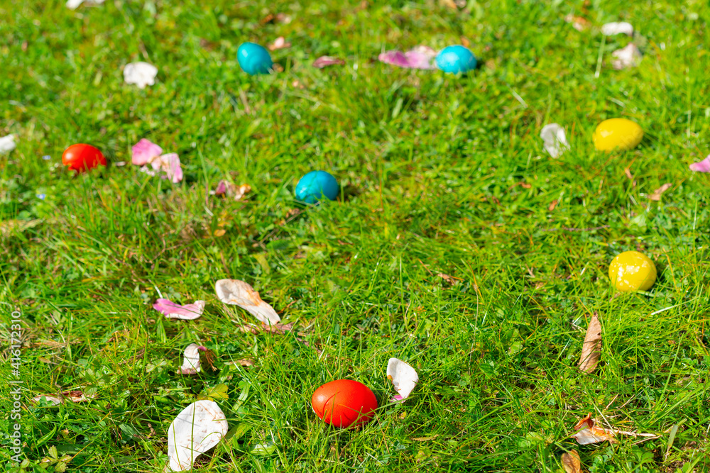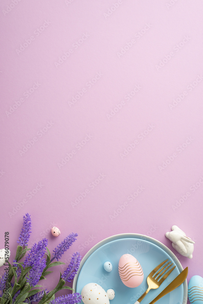 Easter concept. Top view vertical photo of blue dish knife fork colorful easter eggs ceramic bunny and lavender flowers on isolated lilac background with copyspace