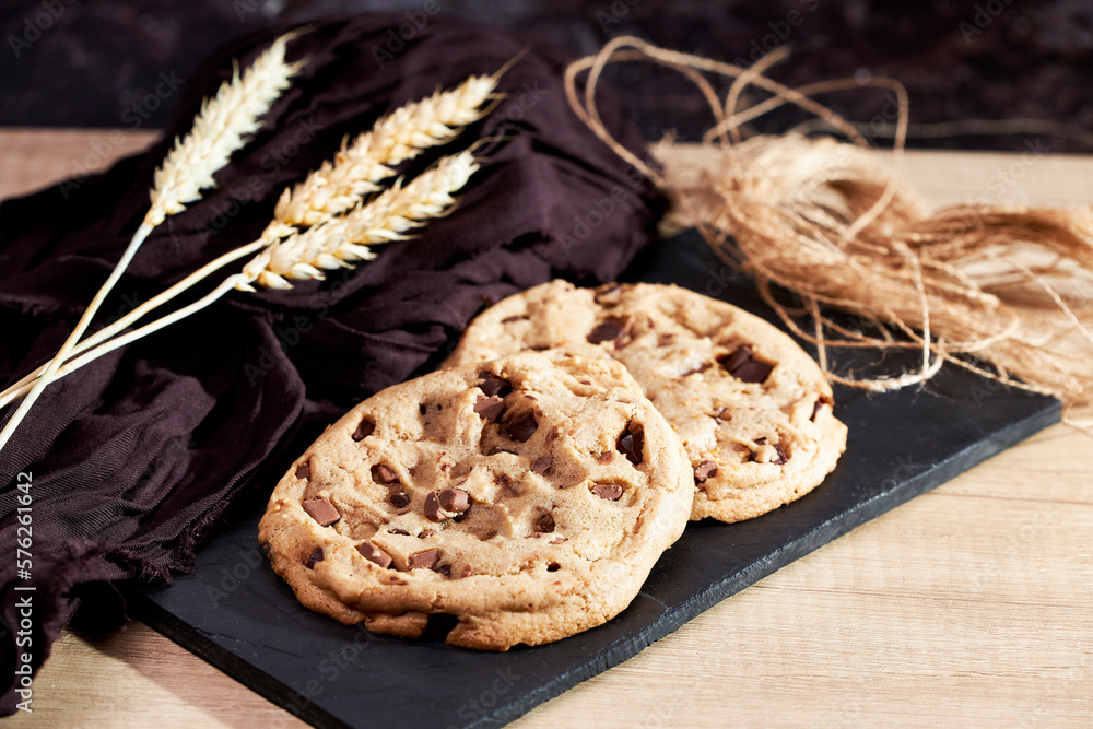 Freshly homemade chocolate cookies on a chalkboard