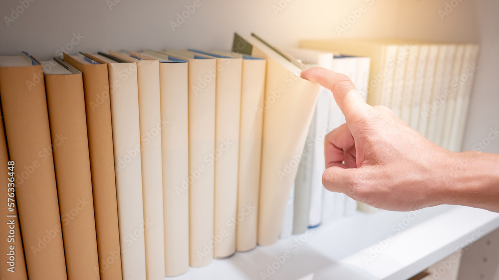 Male hand choosing and picking light beige book on wooden bookshelf in public library. Education research and self learning in university life concepts