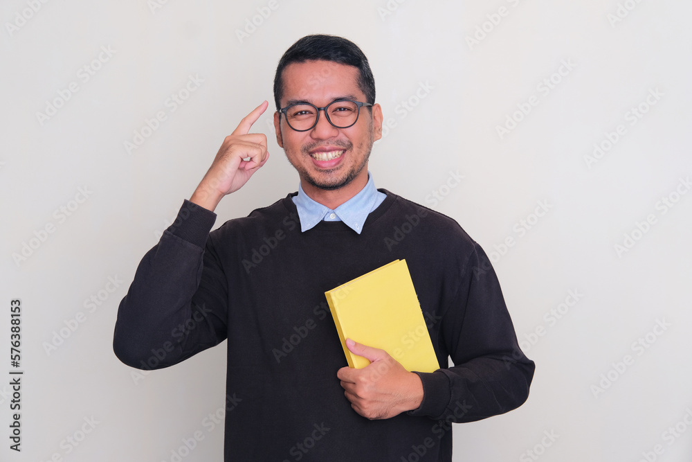Adult Asian man wearing black sweater smiling while holding a book and pointing to his head