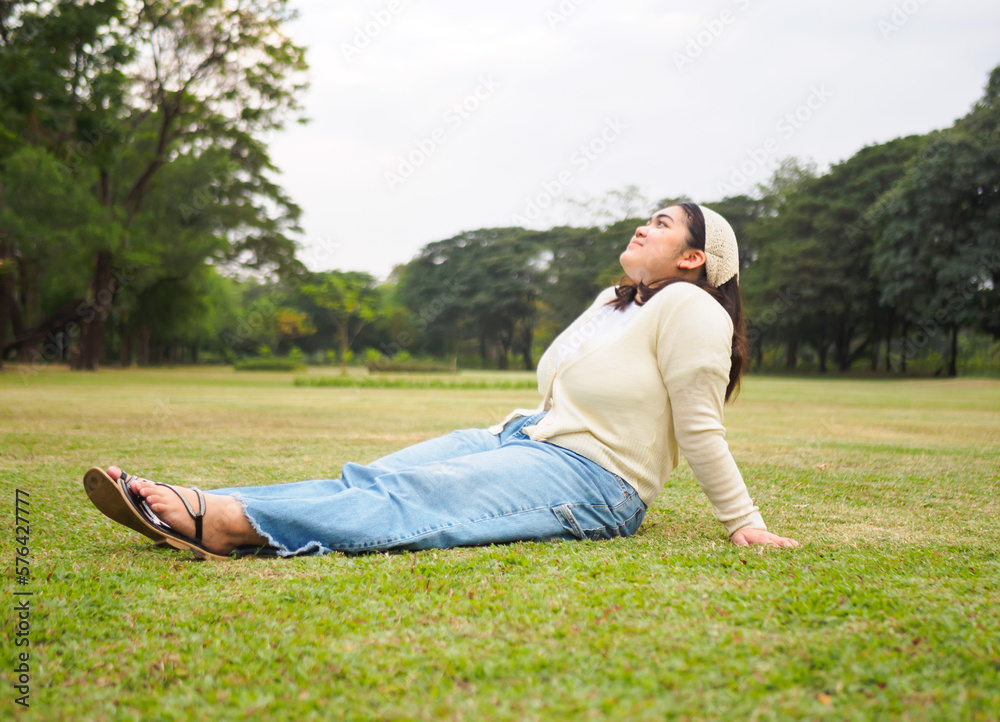 Portrait young woman asian chubby cute beautiful one person wear white shirt look hand holding using smart phone in garden park outdoor evening sunlight fresh smiling cheerful happy relax summer day