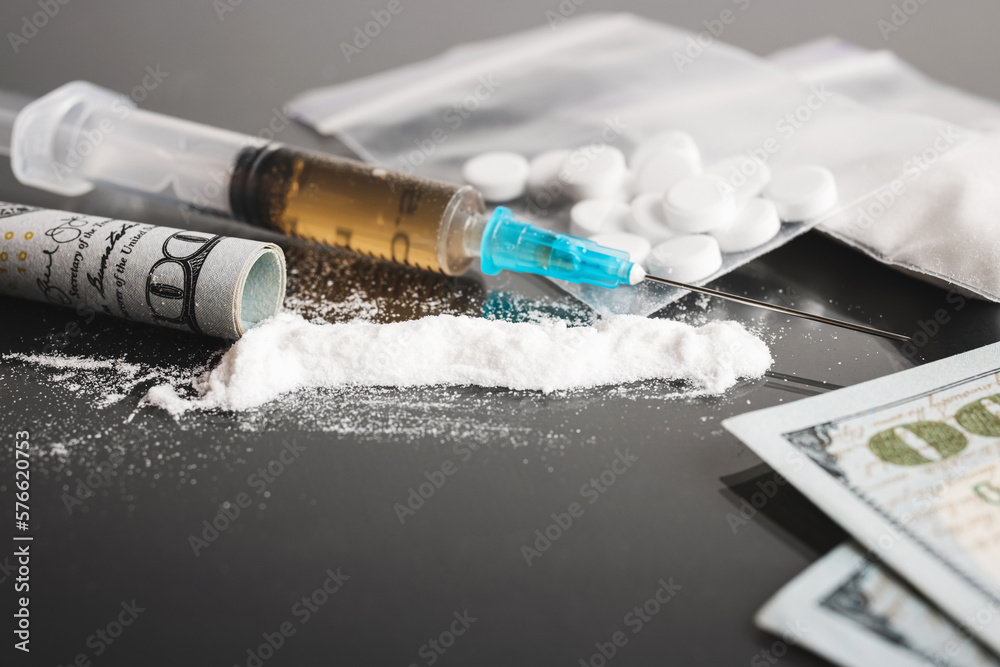 Drugs on dark background, cocaine or heroin white powder, white pills, syringe with a dose and us dollar cash. Drug abuse and addiction concept