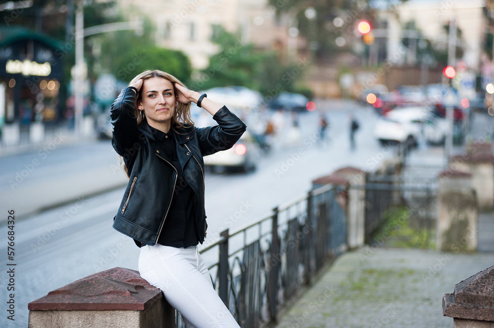 Smiling woman in the city street wearing black leather jacket and white pants and sunglasses