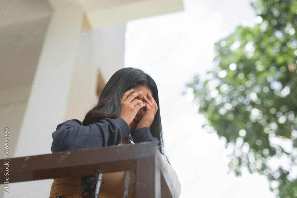 A sad asian woman sobs after breaking up with her boyfriend. Feeling depressed while leaning on the rails of the balcony. Outdoor scene.