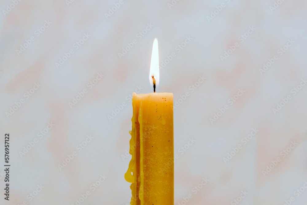 Candle light for spirituality ceremony against grey blurred background.Hot wax drips from the candle.Copy space.