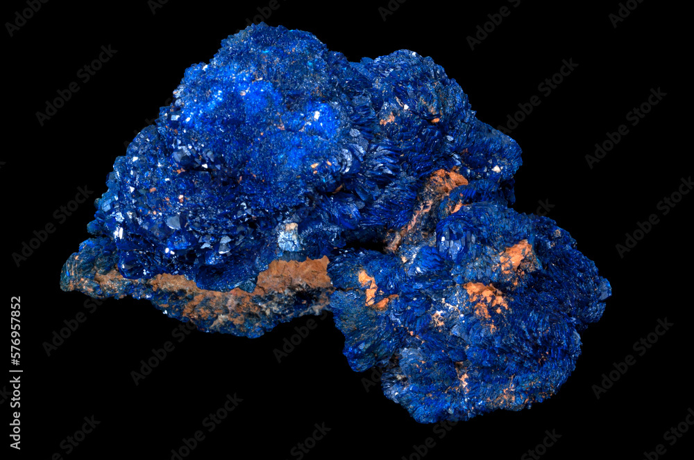 Azurite is a soft, deep blue copper mineral produced by weathering of copper ore deposits. Isolated in black background.