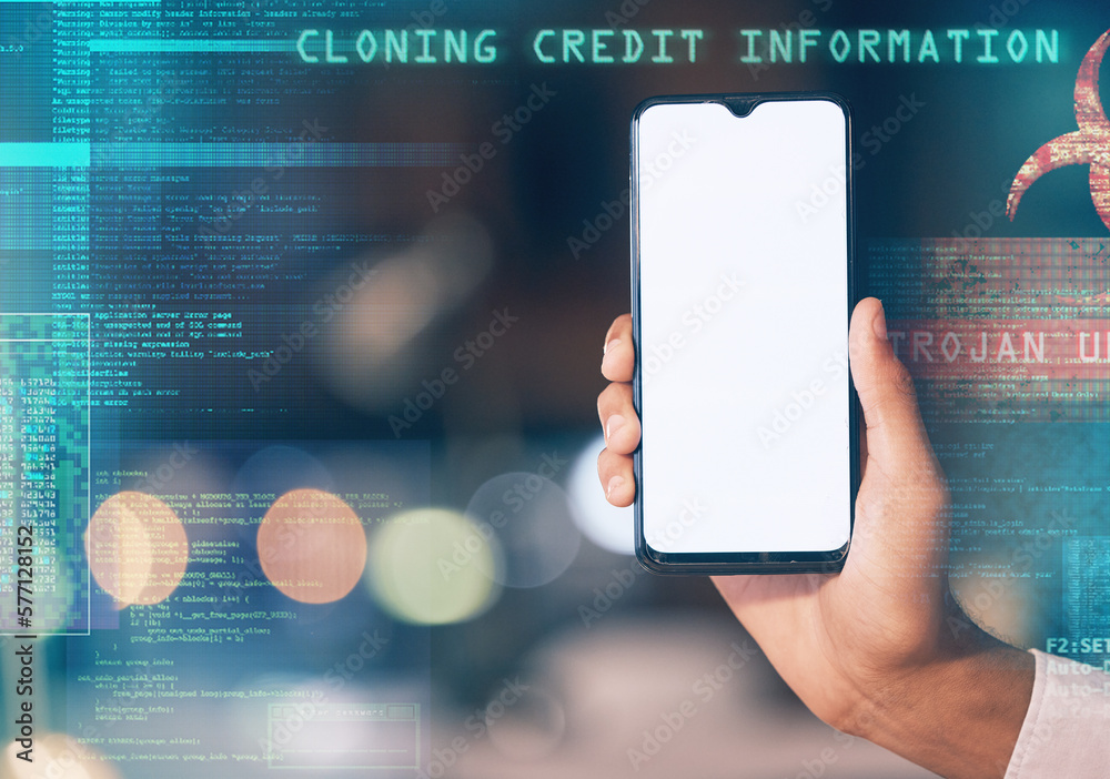 Hands, phone and screen mockup for virus, hacking software or cybersecurity at night in double exposure. Hand of hacker showing smartphone display for mobile app, phishing or malware on overlay