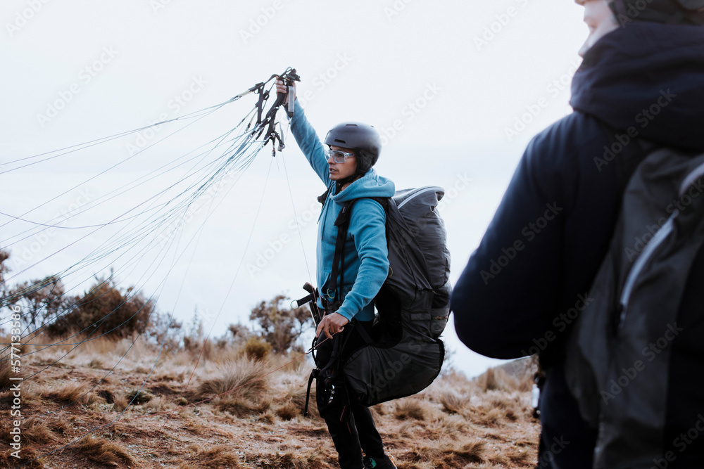 The man extends the jump ropes on a paraglider. A man secures his equipment to jump with a tourist