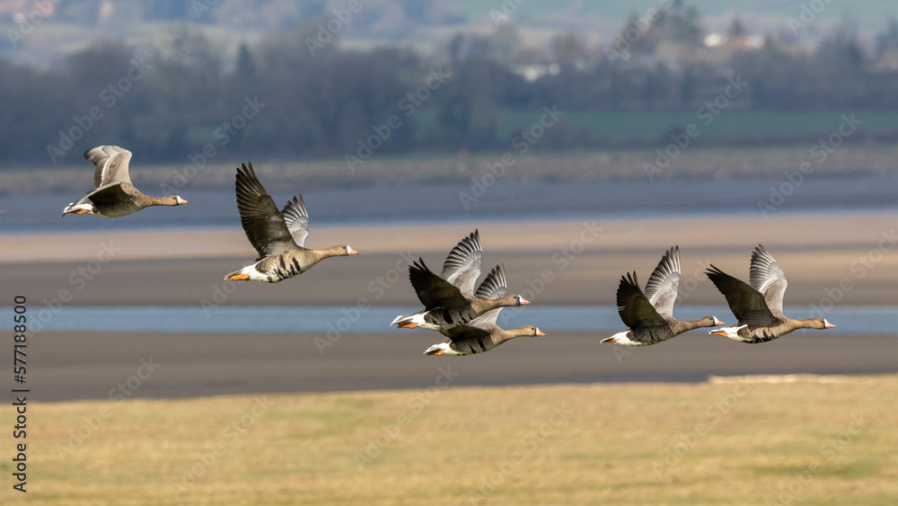 A flight of white fronted geese. Orange bills indicate Greenland residents over wintering here.