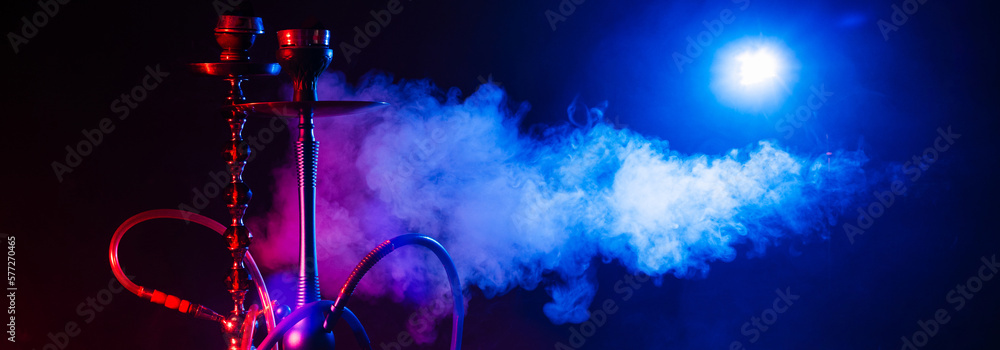 Hookah, shisha on a smoky black background with neon lighting and smoke. Place for your text, Horizontal wide photo subtitle, cover. copy-space