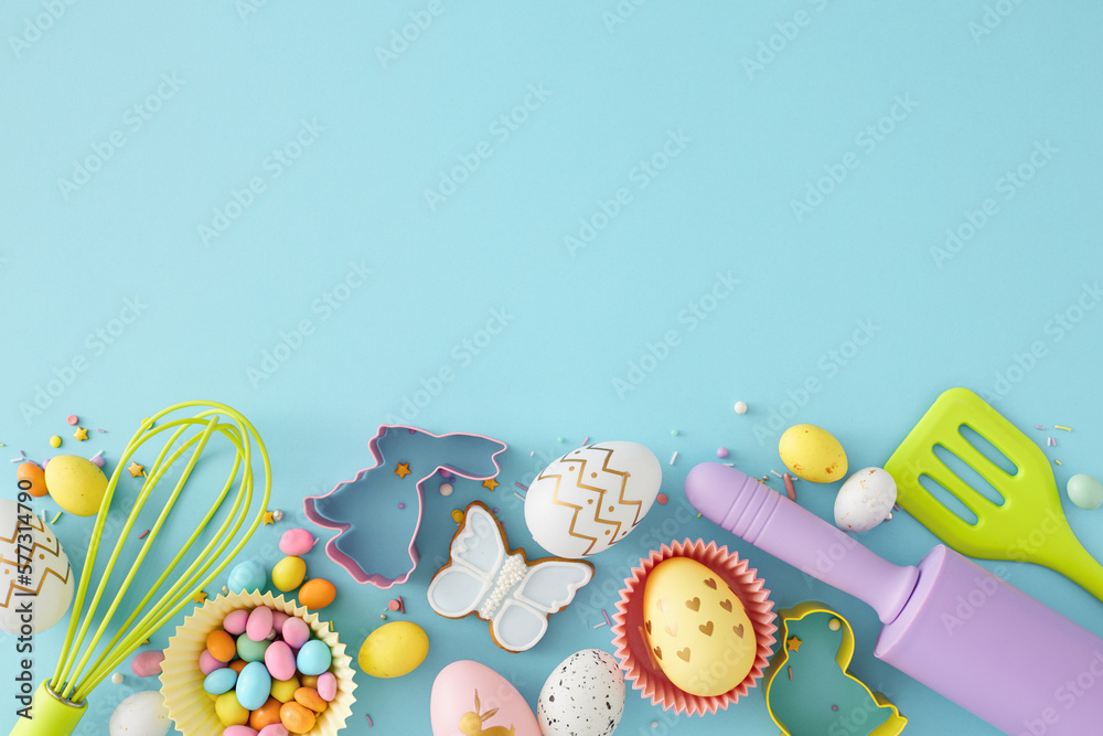 Easter concept. Flat lay photo of colorful easter eggs kitchen utensils baking molds dragees and sprinkles on isolated pastel blue background with copyspace