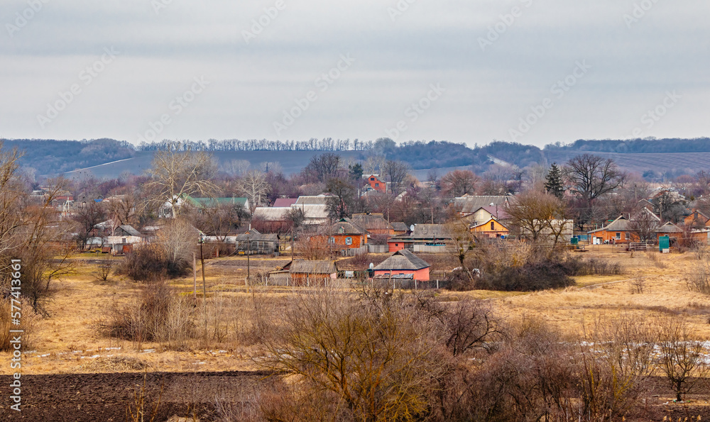 Village and rural houses in the countryside in Ukraine in autumn and winter. Vegetable gardens and plowed land