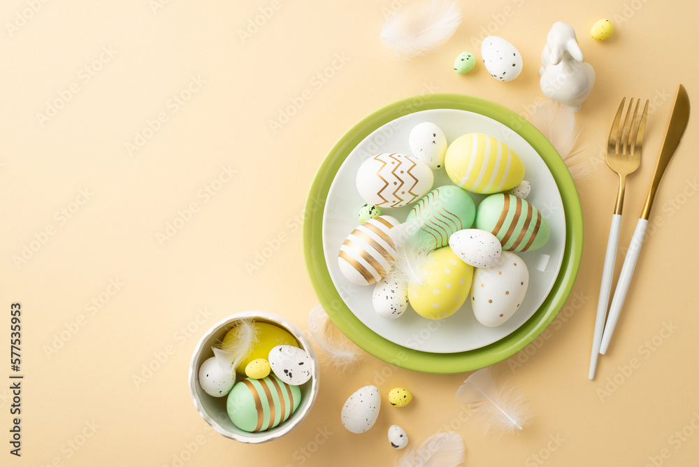 Easter concept. Top view photo of green plate and bowl with colorful easter eggs knife fork ceramic bunny and white feathers on isolated beige background