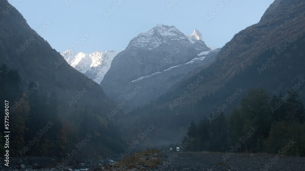 Valley with rocky mountains and moving fog. Creative. Dark mountain valley with rocks and fog. View at foot of Rocky Mountains with fog