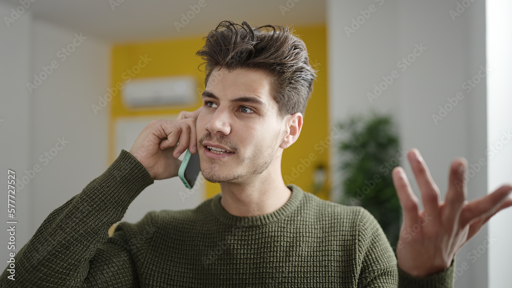Young hispanic man talking on the smartphone with unhappy expression at home
