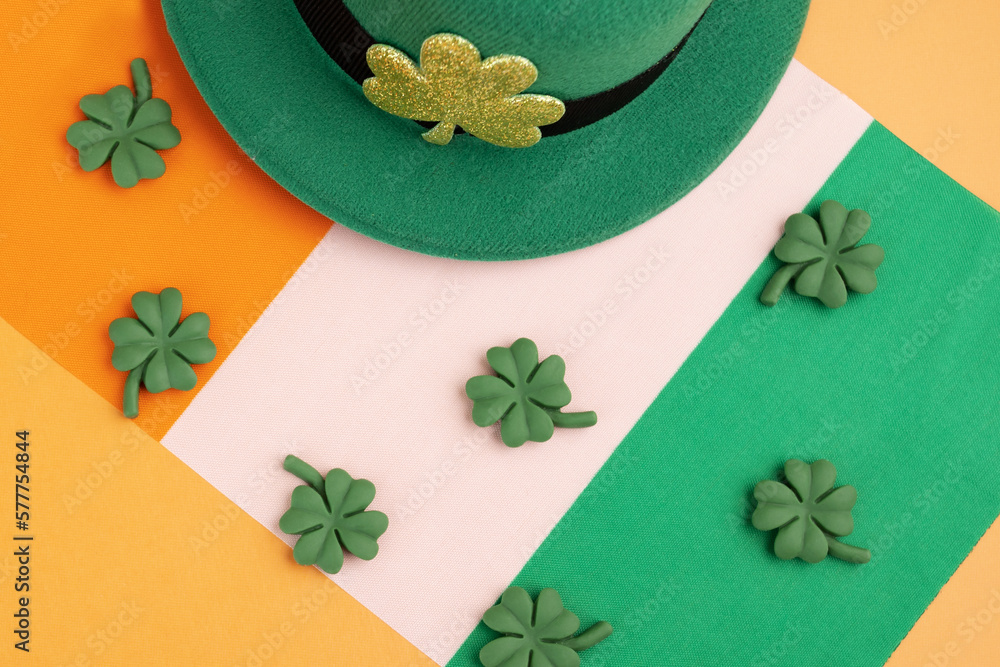 green irish leprechaun hat with shamrocks and irish flag on orange background, saint patrick day banner, irish holiday card, top view