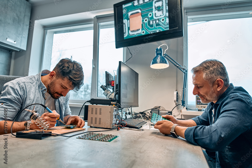 Two men sit at a table and work with microcircuits. Microcircuits on the monitor screen.