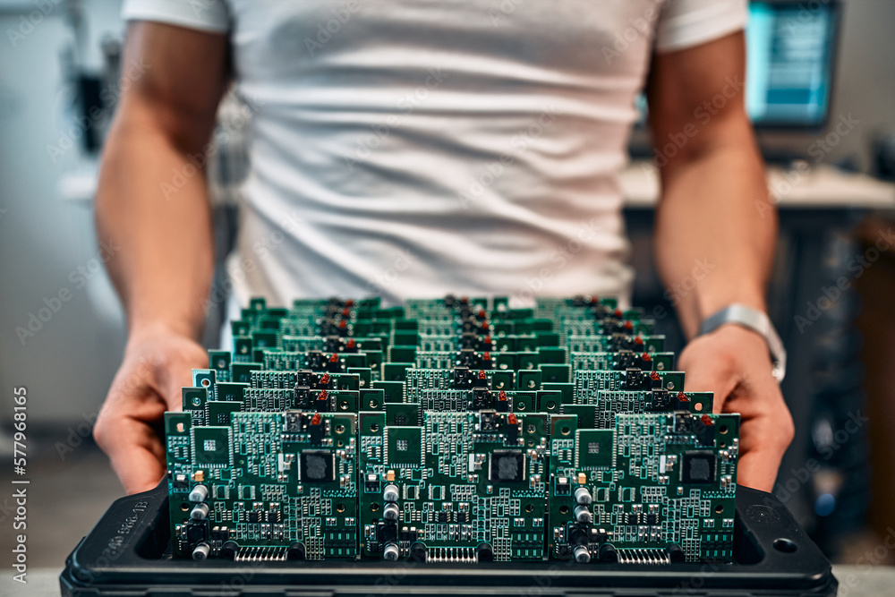 Concept of engineering, chip development and service.Cropped image of man holding many chips.