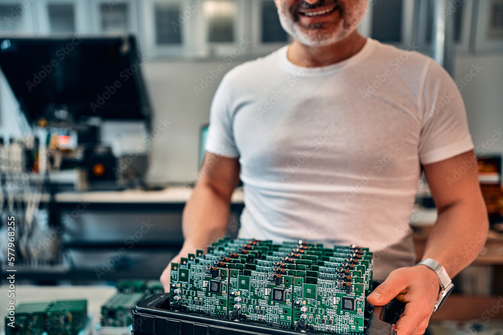Cropped image of man holding many chips.Concept of engineering, chip development and service.