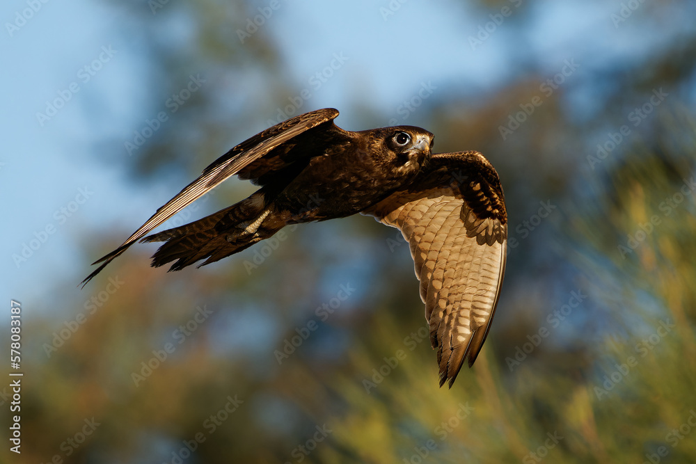 Black Falcon - Falco subniger medium-large falcon endemic to Australia, mainland states and territories, uniform dark brown to sooty black color, perching and flying dark bird