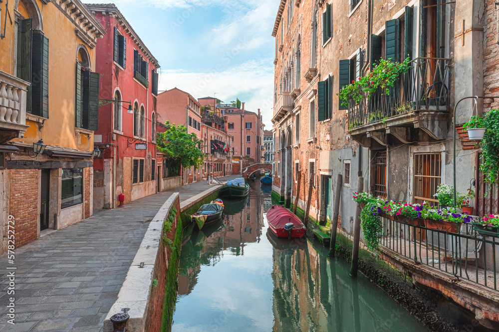 Venice, Italy. View on Venetian medieval street with old colorful buildings and bridge over water canal with boats