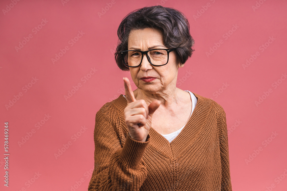 Portrait of angry grey haired old strict senior woman wearing glasses pointing up threatening with finger. Grandmother isolated over pink background.