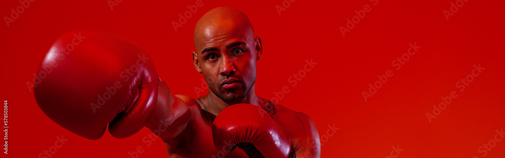 Portrait of sporty man wearing boxing gloves practicing for fight on studio background