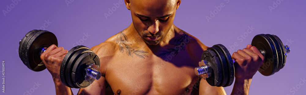 Muscular man doing exercise with weight dumbbells on studio background. Strength and motivation